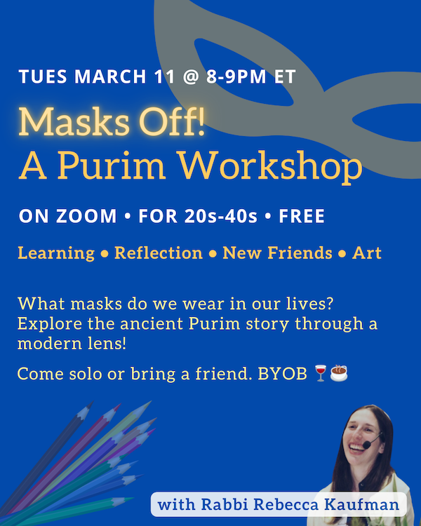 Join me to learn some tid-bits about Purim, themed around the masks we wear in our lives. Ancient stories will prompt us to discuss modern questions. When is concealing our identities a tool? When does it get in our way?